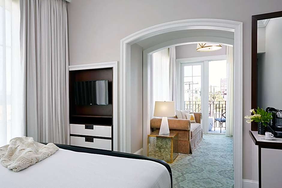 This room features an arm chair, built-in armoire, and dry bar with wood countertop. Extras include a bistro table and 2 chairs. the room is also located on the 2nd or 3rd levels and may have a view of Charleston or an extended bathroom with a tub.